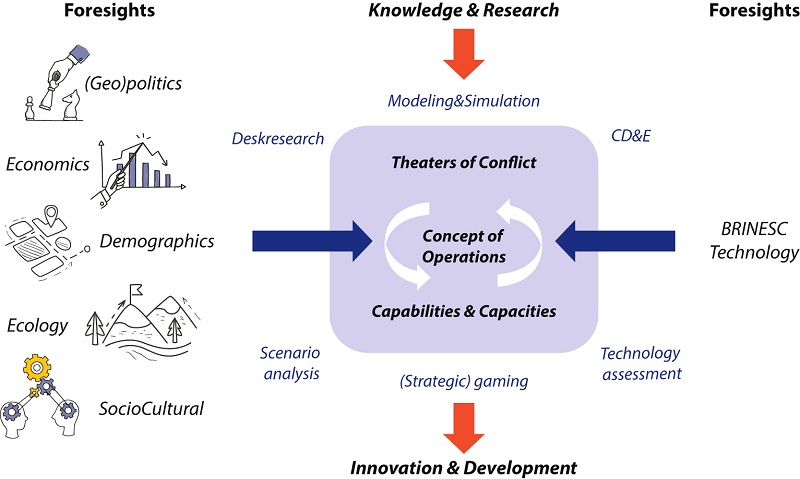 Figuur 1 Imagineering Future Defence aanpak. De DESTEP factoren worden geanalyseerd voor specifieke ‘theaters of conflict’, gebruikmakend van verschillende methoden (zoals ‘wargaming’ en ‘concept development & experimentation’). Kennis over deze factoren wordt samengebracht met domeinkennis over capaciteiten, scenario’s en operaties. De term BRINESC verwijst naar een indeling in technologieën, die later in het artikel aan de orde komt