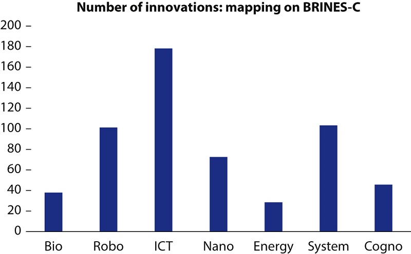 Kortom, er staat ons nog veel te wachten. In het in 2015 gestarte project ‘Technologieverkenningen voor defensie’ houdt TNO een overzicht bij van al deze verwachte, voor defensie relevante innovaties. Momenteel zijn ruim 250 innovaties geïdentificeerd en beschreven. Zoals aangegeven in figuur 3, komen deze voort uit zeven verschillende technologische / wetenschappelijke gebieden (‘BRINES-C’):